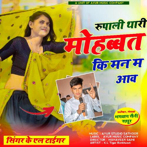 RUPALI THARI MOHBAT KI MAN M AAW is sung by K. L Tiger Borkhandi. Music composed by Mahaveer Saini. Lyrics written by K. L Tiger Borkhandi. Released on 2024-01-12. Label: Ayur Music Company.